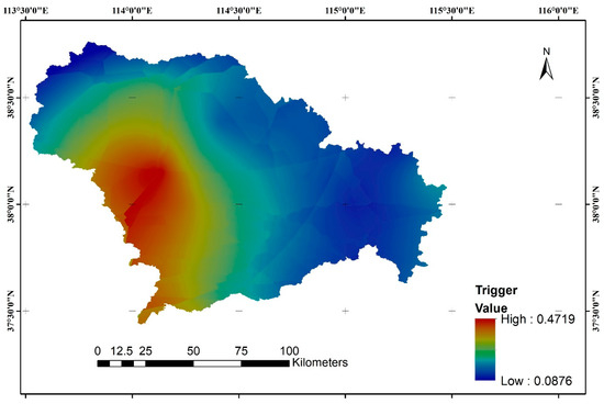 Figure 4 shows that the flood hazard trigger factor was higher on southwest part of the Shijiazhuang area. The reason for the above phenomenon was due to the affection of Taihang Mountains and the continental monsoon climate. Under the combined effect of topography and climate, floods in the southwest area were highly triggered and were prone to flood disasters and mudslides caused by landslides.