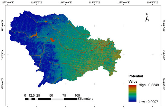 Figure 5 shows that the flood potential in Shijiazhuang was higher in the east and low in the west due to the influence of natural topography and human factors on the surface modification. The potential threat of flood was high in the eastern region, which was because of low topography and the main types of land surface were cultivated land and artificial surfaces in the eastern region. Flood potential was high along rivers and other waters since the risk of flood was higher close to the water.
