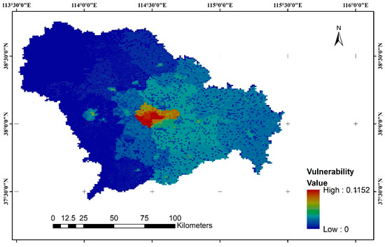 Flood vulnerability factor was mainly determined by economic factors such as GDP, population, and grain production. Based on the weight of AHP (Table 4), the weighted sum tool of ArcGIS 10.2 was used to add flood vulnerability indices V1 to V3 according to Equation (6)