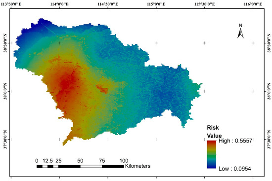 Using the weighted sum tool of ArcGIS, the result of the above three factors were summed up according to Equation (1) to get the result of comprehensive assessment of flood risk in Shijiazhuang. The overall risk of flood disaster in Shijiazhuang was concentrated in the southwestern region, followed by the risk in urban areas, especially in the southwestern region of the urban area (Figure 7). Due to the impact of its own terrain and climate, coupled with urbanization, urban waterlogging was getting worse and worse, and the resistance to floods was getting weaker and weaker.