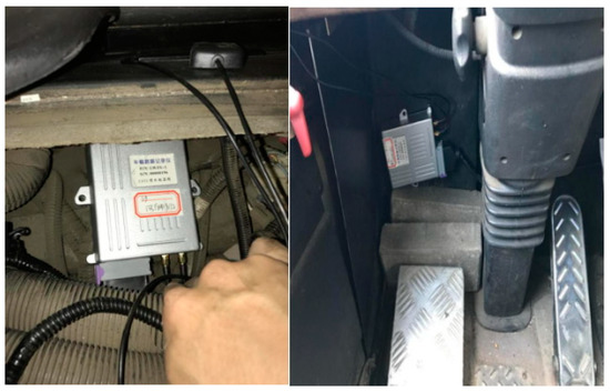 The research data in this study came from a project called “Research on Product Testing Conditions of China’s New Energy Vehicles and Development—Haikou City, Urban Data Collection” by the People’s Republic of China Ministry of Industry and Information Technology. A road test remote information system was adopted in this paper to collect the real-time operation data of public transport vehicles in Haikou City. The system mainly comprises a vehicle data recorder and a vehicle remote management service platform. The vehicle engine data logger collects, records, and transmits the road driving cycle, driving behavior, and vehicle operation data of the actual vehicle operation process, as shown in Figure 1. The device is connected to the vehicle CAN network through the OBD port and obtains real-time travel information in accordance with the SAE J1939 standard protocol. The vehicle engine data logger transmits the data to the remote vehicle management service platform through a wireless communication module. The data collected by the vehicle engine data logger are engine speed, vehicle speed, shift lever position, accelerator pedal depth, instantaneous fuel consumption rate, air–fuel ratio, air conditioning switch status, motor speed, intake air flow, engine torque, GPS time, and location. The remote vehicle management service platform mainly acts as the data transit center and vehicle driving record database. Figure S1 presents a flow chart of the road test remote information system and data analysis.