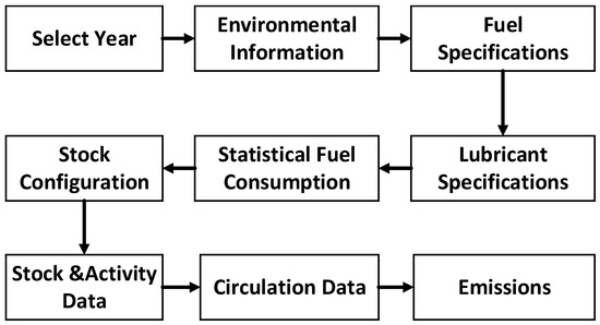 Funded by the European Environmental Agency, the COPERT model was developed to calculate the amount of pollutant emissions per vehicle or fleet for a year. The estimation procedure of the model is shown in Figure 2. The version number of the COPERT model used in this study is V5.0.1145.