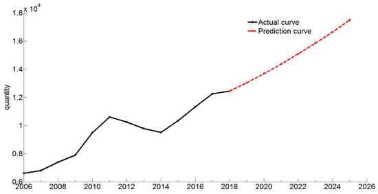 The actual quantity in 2006–2017 and the predicted quantity in 2018–2025 of heavy diesel bus in Hainan Province are shown in Table 5. Hainan Province bus growth trend predicted by the gray prediction model is shown in Figure 3. The gray prediction model predicts that the total number of heavy-duty diesel passenger buses in the province will be 17,900 in 2025.