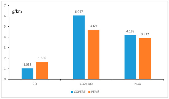 On the basis of the calculation results of the COPERT model, the total CO, CO2, NOx, and PM emissions of heavy-duty diesel passenger buses in Hainan Province are 2207, 1,299,605, 9004, and 254 t/yr, respectively. The CO, CO2, and NOx emission factors of coaches are compared with the PEMS test results, as shown in Figure 4:
