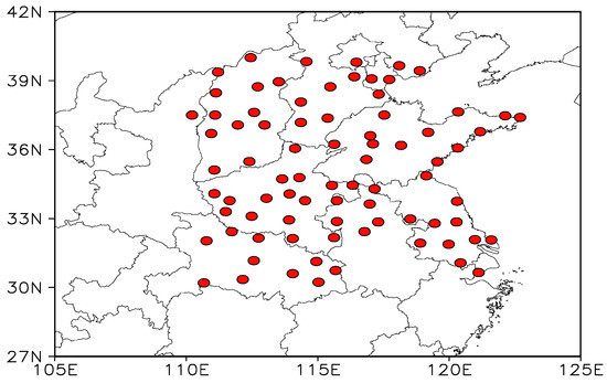 The meteorological observation data in this study were obtained from the China Meteorological Administration (CMA). Observations including weather phenomena, visibility, temperature, relative humidity, and wind speed were recorded four times daily (02:00, 08:00, 14:00, and 20:00 LCT). The observation data for the period from 1980 to 2015 from the stations in the region (30–40 °N, 110–125 °E) were analyzed. However, the data from 1993 and 2000 were excluded due to the lack of data. Eighty stations were selected.