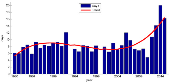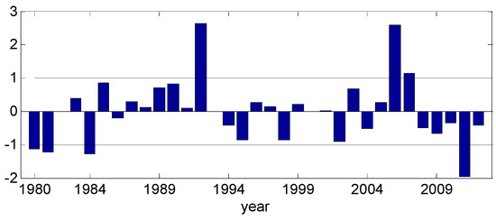The pollution emissions in Eastern China significantly increased from 1980 to 1990 and from 2000 to 2010, and slowly decreased from 1990 to 2000, which was found in the IPCC Fifth Assessment Report’s (AR5) emissions inventories [34]. Xie and Han [35] and Fu and Dan [5] also gave similar statistical results. With respect to the emissions change trend, we use a cubic function to detrend the data, which is shown as the solid red line in Figure 2. The number of haze-fog days followed an increasing trend from 1980 to 1990 and from 2003 to 2015 but a decreasing trend from 1991 to 2002. The number of haze-fog days after the removal of trend will be used in later study.