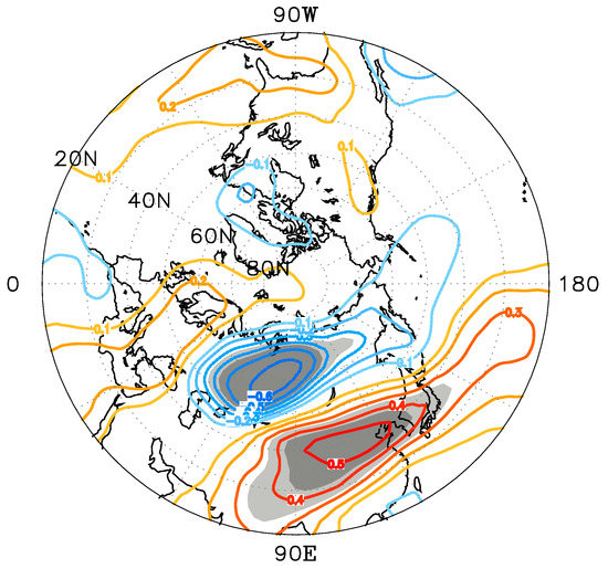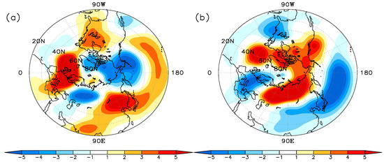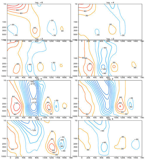 Figure 13 shows the vertical distribution of the geopotential height anomaly in the negative EU phase (Figure 13). At a lag of −4 days, a positive anomaly and a weak negative anomaly emerge over Europe. A positive anomaly emerges over Siberia. Then, these anomalies strengthen. These geopotential height anomalies tilt a little eastward, which demonstrates a small baroclinic structure. At a lag of −2 days, a three-center structure of the EU pattern is formed, and the geopotential height anomalies become barotropic. The geopotential height anomalies over Eurasia exhibit the maximal value at a lag of 0 days. After that, an obvious decay of the EU pattern commences. The negative phase is the opposite of the positive phase (not shown). The analyses indicate that the baroclinicity may play a role in the beginning of the geopotential height anomaly, but the maintenance and development of the anomalies are mainly ascribed to barotropic instability [39].