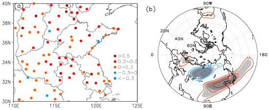 The heterocorrelation of the first mode of the SVD between the number of haze-fog days (a) and the 500 hPa geopotential height (b) in January from 1980 to 2015 (the shaded area denotes that the 99% confidence level is exceeded).