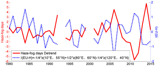 The detrended number of haze-fog days (red, units: days) and the EU index (blue) in January from 1980 to 2012.