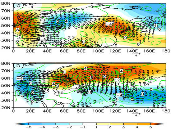 The wave activity fluxes in the higher haze-fog years and lower haze-fog years are calculated based on the 500 hPa geopotential height and the wind field data. The contour in Figure 8 represents the vertical wave activity flux, and its marked value is multiplied by 103. The positive value indicates that the wave activity flux propagates upward. The arrow indicates the horizontal wave activity flux. It shows that there is essential significant quasi-stationary planetary wave activity associated with the anomalous geopotential height (Eurasian teleconnection) over the Eurasian continent. The wave activity flux propagates from northwestern Europe to northern China. There is also wave activity flux propagation in the vertical direction.