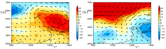 Compound field of the January geopotential height anomaly (shading, units: gpm) and wind (vector, units:m/s) of 850 hPa in January of the higher haze-fog years (a) and lower haze-fog years (b).