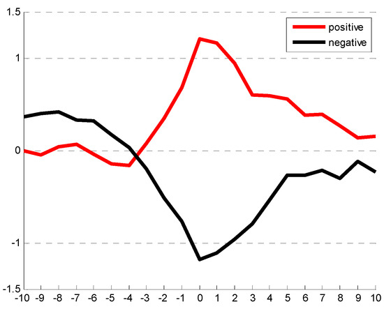 Composite of the EU index from a lag of −10 to 10 days. A lag of 0 day denotes the peak phase. The red line denotes the positive phase and the black line is the negative phase.