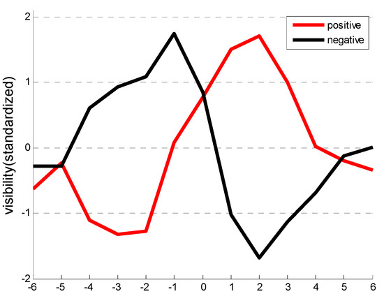 Average standardized visibility anomalies in Northern China around the peak phase of the EU pattern from a lag of −6 days to a lag of 6 days. The red line is the positive phase and the black line is the negative phase.