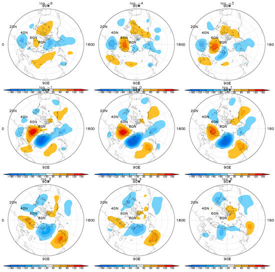 The 500 hPa geopotential height anomaly field in the negative EU phase at a lag of −6 days, 4 days, −3 days, −1 day, 0 days, 1 day, 3 days, 4 days, and 6 days, respectively.