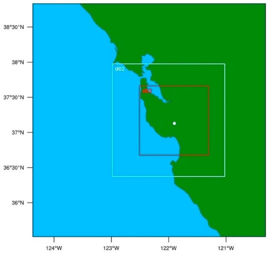 Weather Research and Forecasting (WRF) model domain setup. d02 = 1 km, d03 = 1/3 km. The white dot in the center of d03 depicts the location of the San Francisco Bay Area WSR-88D (KMUX).