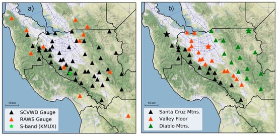 Station locations within the model domain: (a) Remote Automated Weather Stations (RAWS) gauges are used to perform quality control on Multi-Radar Multi-Sensor (MRMS) grids. Santa Clara Valley Water District (SCVWD) gauges are used for model analysis. Location of KMUX central to the domain provides the entire domain with high quality radar measurements; (b) SCVWD stations as categorized by zone. Stars represent locations used for radar time-height cross-sections. Black star = Huddart Park, red star = San Jose, green star = Biel Ranch.