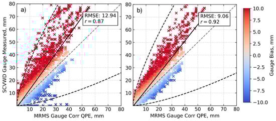 MRMS vs. SCVWD hourly accumulated precipitation for both events (a) before QC; (b) after QC. Dark dashed lines are bounding equations from Qi et al. [].