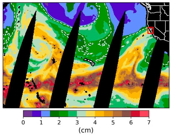 Rainfall along the California coast is known to be highly variable, due to its complex topography []. Annually, about 25%–50% of the precipitation along the west coast comes in the form of long, narrow corridors of moisture called atmospheric rivers [,,]. These features are typically thousands of kilometers long and less than 500 km in width with anomalously high precipitable water usually exceeding 2 cm []. About 80% of water vapor transport in atmospheric rivers exists below 700 hPa (~3 km) []. Atmospheric rivers are historically responsible for many floods and extreme precipitation events in the western US []. Studies by the National Oceanic and Atmospheric Administration (NOAA) Hydrometeorological Testbed (HMT) in 2005 and 2006 found that 18 out of 20 of the most extreme precipitation events in the National Weather Service western region were due to atmospheric rivers []. While synoptic-scale dynamics might play a significant role, the dominant force during extreme events is orographic lift []. Large mountain ranges are not the only places where precipitation enhancement due to orographic enhancement occurs. Previous research has shown that smaller terrain barriers, such as the Santa Cruz Mountains, ranging from sea-level to 1154 m (3786 ft), can also significantly enhance precipitation [,].