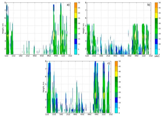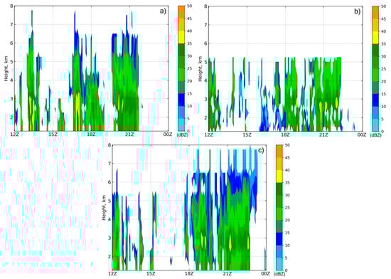 The stronger of the two events occurred on 16 November 2017 (AR1), where as much as 85 mm of rain was recorded in the domain. The Special Sensor Microwave Imager (SSM/I) polar-orbiting satellite shows the narrow plume of water vapor directed at the California coast with precipitable water (PW) values exceeding 3.5 cm near the coast (Figure 4). The nearest upper-air observing site (Oakland) recorded a PW of 3.54 cm and a freezing level of 3,266 m at 12:00 UTC on 16 November 2017. At this time, an upper-level (500 hPa) trough was located over the Pacific Ocean, off the coast of British Columbia, with weak ridging downstream over the central United States and into Saskatchewan. Strong quasi-geostrophic (QG) ascent existed over the domain with a 115-knot jet streak (300 hPa) stretching from the Bay Area into Western Montana. According to the 12:00 UTC Oakland sounding, the atmosphere was conditionally unstable up to about 500 hPa, beyond which the environmental lapse rate was approximately moist adiabatic. The combination of conditional instability and strong synoptic forcing allowed moist parcels to be lifted well above the feezing level. This is evident when looking at a time–height cross-section of the radar data (Figure 5). One station in each zone with the best possible vertical radar coverage was selected (Figure 2b), and each used the gridded data output from the previously discussed Radx software. All three stations showed radar echoes extending well beyond the freezing level and represented a BB rainfall signature to some degree, which was evident in and . The rainfall came to an abrupt end with the cold frontal passage between 00:00–03:00 UTC on 17 November 2017.