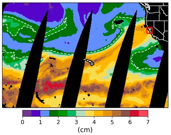 SSM/I satellite image of daily average column integrated water vapor for 6 April 2018. Red box is the approximate model domain. Dashed white line = 2 cm.