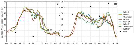 Upslope water vapor flux at Big Basin Redwoods State Park on (a) 16 November 2017 starting at 00:00 UTC and (b) 6 April 2018 starting at 06:00 UTC. * denotes 1/3 km resolution.