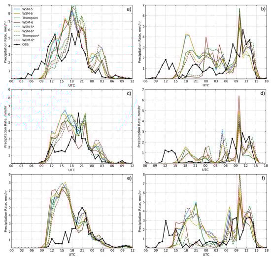 The timing of the frontal passages was predicted reasonably well by the models, in both events. All of the models were about three hours too slow with the warm frontal passage in AR2. However, all of them reasonably predicted the strength of the forcing near the warm front. Albeit late, the rainfall that fell during the warm front was eventually accounted for by the models. Neiman et al. [] used the 850–1150 m mean wind speed and PW to derive upslope water vapor flux. The same methodology was applied here to diagnose the degree of orographic forcing present in the ARs (Figure 8). With no profiling sites available, a point was arbitrarily chosen on the windward slope of the Santa Cruz Mountains, near the Big Basin Redwoods State Park (upwind of San José). NAM analysis grids (same as that used for model initialization) were used in place of direct observations. Aside from the onset and ending of rainfall with the frontal passage, integrated water vapor (IWV) did not fluctuate very much throughout the event, so wind speed fluctuations were the main contributors to large changes in upslope water vapor flux during the ARs. Observed rainfall rates generally correlated well with upslope water vapor flux in all zones (Figure 9). With this, we can conclude that orographic forcing played a role in modulating the rainfall rates during both events. During the NBB portion of AR2 (from 6 April 15:00 UTC to 7 April 08:00 UTC), upslope water vapor flux remained high, yet rainfall rates were markedly lower (Figure 9b,d,f). In the absence of strong synoptic or mesoscale forcing, it was evident that orographic forcing was the primary driver of precipitation during this time; thus, the warm rain process dominated. For AR1, it seemed that the strength of the synoptic forcing was overdone by the model in the Valley Floor and the Diablo Mountain zones. The rainfall rates were significantly higher, with not much change in the upslope water vapor flux. After this initial overestimation, all models simulated rainfall rates relatively well.