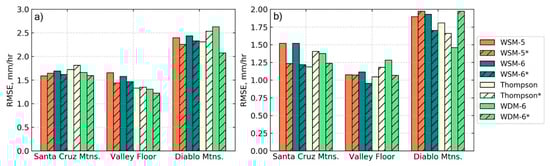 The models generally predicted rainfall rates with the lowest root-mean-square error in the Valley Floor zone (Figure 10). This agrees with previous research stating that the predictability of precipitation was lower near the threshold between regimes (e.g., in or out of a rain shadow) []. Since most of the rain gauges in the Santa Cruz Mountains zone are on the leeward side of the mountain range, these might be considered to be near this threshold. As expected, rainfall rates during AR1 were better represented by the double-moment microphysics (MP) schemes, especially in the Valley Floor zone. This was likely because the cold cloud process dominates much of the precipitation fallout over this area, since the Valley Floor is in a rain shadow and the degree to which orographic forcing enhances precipitation was smaller. In contrast, the single-moment MP schemes predicted rainfall rates with nearly the same amount of accuracy as the double-moment schemes for this event. For AR2, there was no clear winner regarding simulated rainfall rate. An exception was in the Diablo Mountains zone where the high-resolution (1/3 km) WSM-5 scheme, low-resolution (1 km) WDM-6 scheme, and both resolutions of the Thompson scheme predicted rainfall rates with significantly higher accuracy. The low-resolution, single-moment schemes also experienced significant amounts of error when compared to the high-resolution simulations in the Santa Cruz Mountains zone. This could be due to the better representation of the terrain features. The high-resolution, double-moment schemes performed well in this case, possibly due to the relatively simple physics involved in the NBB rainfall process, which dominated AR2. Accumulated rainfall for AR2 was predicted with higher accuracy than for AR1, possibly owing to the long period of precipitation lacking in complex mixed-phase microphysics (NBB rainfall). For the low-resolution simulations, the double-moment MP schemes predicted accumulation with a higher accuracy than the single-moment MP schemes in most cases, except the Valley Floor in AR2, where all schemes performed well.