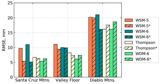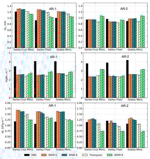 Overall, the double-moment MP schemes produced more accurate rainfall rates in the Valley Floor and Diablo Mountains during AR1, but contained similar errors to the single-moment MP schemes during AR2. This was likely due to the simpler precipitation production process (NBB) during much of AR2, in which the simplicity of the single-moment MP schemes might be sufficient to provide an accurate simulation. There seemed to be no clear result regarding the accuracy of the models and horizontal resolution. Due to this reason, and since this model is operational and needs to be as computationally efficient as possible, a resolution of 1 km will be retained. When considering the 1 km resolution model over both events, the WDM-6 scheme provided the lowest error in accumulated rainfall (Figure 13). The performance of this scheme was especially noticeable for AR2, where both rainfall types (BB and NBB) were present for extended periods. Future research will be needed to verify this, but it was hypothesized that this was due to the double-moment warm rain microphysics (mixing ratio and number concentration of cloud and rain), where the Thompson scheme provided double-moment predictions of ice and rain. The warm rain microphysics might be the more important foci for this locale, since mixed-phase and frozen precipitation at the surface are extremely rare, and nearly all precipitating clouds are affected by orographic forcing, to some degree. Previous research in the southeastern United States found that 15%–20% of the total accumulated precipitation can be contributed to NBB rainfall []. This is relatively close to what was observed during AR2 (~21%). As expected, the highest NBB accumulations occurred in the Santa Cruz and Diablo Mountains zones, where the orographic forcing was stronger. Further research is needed to determine the contribution of the NBB rainfall on the seasonal scale, but based on the contribution found here in AR2, it is assumed that NBB rainfall accumulations cannot be ignored when evaluating model performance. This is especially true for urban areas and catchments that might flow into urban areas. A multi-year rainfall climatology is needed to further assess the overall contribution of NBB rainfall in this region. Additionally, although the two ARs chosen for this study contained large differences in their durations of BB and NBB rainfall, more events will ultimately need to be studied to fully assess MP scheme accuracy for this region.