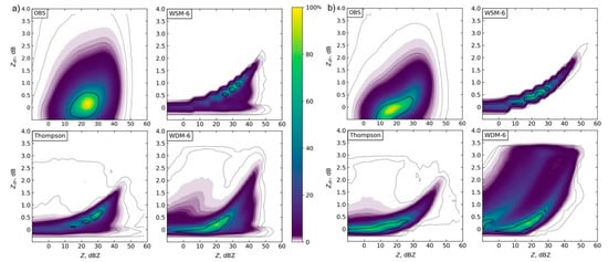 Precipitation parameters calculated via radar variables from the simulations and observations showed little spatial variability, when averaged for each zone (Figure 11). An exception was an increase in the observed inland, which was expected due to the orographic enhancement and was consistent with findings of previous research []. Due to the lack of spatial variability in this study, the DSD was evaluated without regard to zone for simplicity. Normalized joint probability density functions (PDF) of vs. were created to study the model representation of raindrop size statistics (Figure 12). The PDFs for the 1/3 km domain were nearly identical to those from the 1 km domain over the same area for both ARs; thus, only the 1 km PDFs are shown. The PDFs for the single-moment schemes were also nearly identical to each other, so the WSM-5 PDF was not shown. The peak frequencies in the observed PDFs were 24 dBZ and 0.11 dB for AR1, and 18 dBZ and −0.1 dB for AR2. 50% of the distribution extended from 15 to 30 dBZ () and −0.4 to +0.5 dB () for AR1, providing evidence of the relatively stable DSD. The PDF of AR2 showed more variability where 50% of the distribution existed in the range of 9 to 30 dBZ () and −0.5 to +0.5 dB (). Both single-moment schemes had abnormally high frequencies of large drops, when compared to the observations for both ARs. The Thompson scheme overestimated the frequency of large drops in AR1 and small drops in AR2. The WDM-6 scheme best represented the maximum frequency in both ARs, but contained too many small drops at a lower . As stated by Brown et al. [] and seen here, these low reflectivities in the WDM-6 scheme might not have been observed due to a lack of sensitivity in the radar at long ranges. In addition to overestimating the drop sizes, the Thompson scheme overestimated the frequency of high for . The WDM-6 scheme produced an unrealistic DSD with an abnormally high frequency of large across the entire range of for AR2. While the Thompson scheme (both ARs) and the WDM-6 scheme (AR1) produced a similar distribution, they were at a much lower frequency.