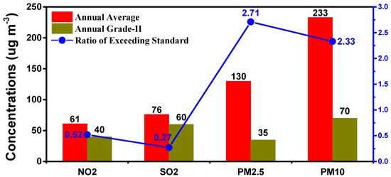 NO2 and SO2—gaseous precursors of secondary PM2.5—were the main contributors for ambient PM2.5 formation. Annual average concentrations of NO2, SO2, PM2.5 and PM10 and the ratio of exceeding Chinese NAAQS guidelines in Xingtai are shown in Figure 2. Annual average levels of NO2, SO2, PM2.5 and PM10 were 61, 76, 130, and 233 µg m−3, respectively. It can be seen from Figure 2 that PM2.5 had exceeded by 2.71 times the Chinese NAAQS values of 35 µg m−3 for PM2.5, and PM10 had exceeded by 2.33 times the Chinese NAAQS values of 70 µg m−3 for PM10, respectively. Thus, it can be ascertained that PM2.5 was the first primary pollutant in Xingtai because the ratio by which it exceeded guideline levels of PM2.5 was the highest. In 2014, in addition to Baoding (162 µg m−3), Xingtai ranked second in PM2.5 levels in Hebei Province, which was slightly higher than Shijiazhuang (124 µg m−3) [10]. Therefore, Xingtai’s PM2.5 pollution has been an extremely serious environmental problem, which placed tremendous stress on local governments.
