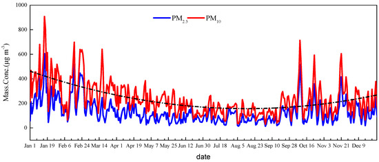 Xingtai’s PM2.5 and PM10 mass concentrations from January 2014 until December 2014 were monitored by on-line instruments and are shown in Figure 3. Clear seasonal variation in PM2.5 mass concentrations can be observed, with a high concentration of 200 µg m−3 in winter (December–February) and a low concentration of 77 µg m−3 in summer (June–August), respectively. PM10 had the same seasonal characteristics as PM2.5, with a high concentration of 325 µg m−3 in winter and a low concentration of 138 µg m−3 in summer. High PM2.5 mass concentrations in winter might be closely related to both lots of continued local pollutant emissions and adverse meteorological condition (such as high RH and temperature inversion). Low PM2.5 mass concentrations in summer were partly due to frequent precipitation events and favorable atmospheric diffusion, which led to efficient removal of particles from the atmosphere. In China, heavy pollution episodes often happen in autumn and winter and can be classified into two types: (1) An explosive growth of PM2.5 within a few hours; (2) and a continuous increase of PM2.5 in several days [2]. For instance, from January 12 to January 16, PM2.5 mass concentrations in Xingtai showed a continuous increase and the peaking concentrations were 606 µg m−3, which were 8 times higher than that (75 µg m−3 for PM2.5) of Chinese NAAQS.