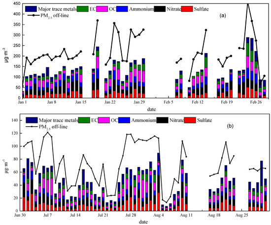 In total, 236 and 240 valid ambient PM2.5 samples were collected in cold and warm periods, respectively. PM2.5 mass concentrations (off-line data, filter-based), and organic carbon (OC), elemental carbon (EC), water-soluble inorganic ions (WSIIs), and trace elements for both cold and warm periods in Xingtai are listed in Table 1. The time series of major PM2.5 components for cold and warm periods are shown in Figure 4a,b, respectively. PM2.5 mass concentrations in Xingtai ranged from 66.73 to 458.48 μg m−3 with an average of 214.53 ± 87.46 μg m−3 in the cold period, and changed from 13.19 to 121.38 μg m−3 with an average of 81.43 ± 35.08 μg m−3 in the warm period. The average concentrations were over 6 and 2 times higher than Chinese NAAQS values for PM2.5 (35 μg m−3), respectively. It can be seen in Table 1 that the PM2.5 level for the cold period was approximately 3 times higher than that of the warm period in Xingtai.