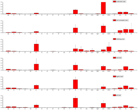 Eight source categories were identified, including construction dust, coal combustion, metallurgical dust, road dust, fugitive dust, soil dust, vehicle exhaust dust, secondary sulfate and secondary nitrate. Since CMB does not distinguish secondary sources, “pure” sulfate (contains only 72.7% sulfate ion in (NH4)2SO4) and “pure” nitrate (contains only 77.5% nitrate ion in NH4NO3) are assumed as secondary sources in the source profile. As a result, the method identifies the contribution of gas-to-particle formation [32]. In total, 476 samples consist of 8 water-soluble ions, 16 chemical elements, OC and EC were used in the source apportionment.