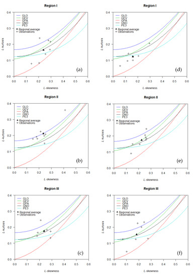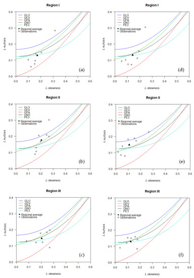 In addition, an L-moment ratio plot is also used for selecting a probability distribution function by comparing its closeness to the L-skewness and L-kurtosis combination. The L-moment diagrams for RX1day, RX5day, RX7day and R95P in three regions are illustrated in Figure 3 and Figure 4, respectively. In terms of RX1day series as a paradigm, Figure 3a–c show that the GNO distribution is closer to the corresponding regional average value in region I, the GLO distribution is closer to the corresponding regional average value in region II, and the GEV distribution is closer to the corresponding regional average value in region III. Therefore, these figures demonstrate that the results of L-moment ratio plots are consistent with the results of the goodness-of-fit measure.