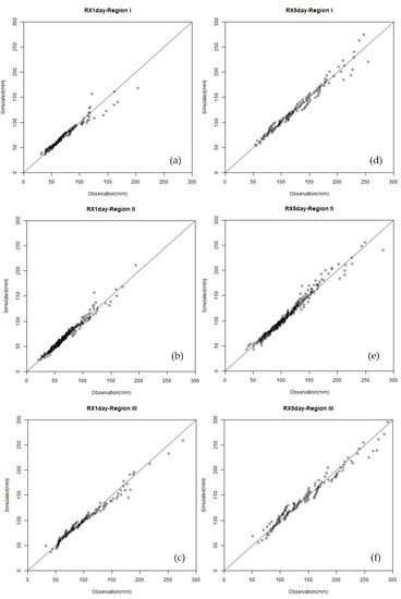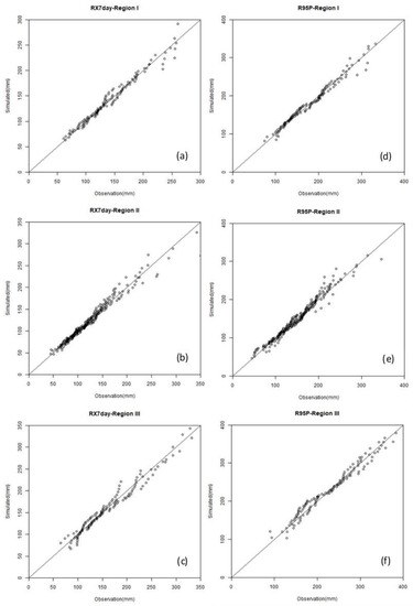 Figure 5 and Figure 6 plot the observed and simulated values for each region of RX1day, RX5day, RX7day, R95P series, respectively. They show that the points fall on the line closely enough for the optimal distributions for each HOM region. The MARE results for each HOM region of RX1day, RX5day, RX7day, R95P series summarized in the last column of Table 3 demonstrate that the MARE values range from 3.19% to 6.41% and the best-fit distribution for each HOM region can describe the precipitation extremes well. Hence, it is reasonable that the best-fit distributions for each of the HOM regions are adequate in predicting the quantile estimates according to the results above.