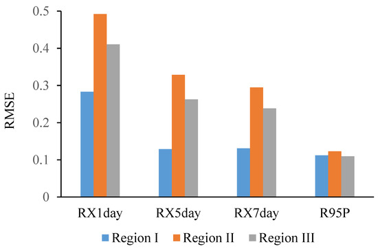 The RMSE values of three HOM regions for RX1day, RX5day, RX7day and R95P when return period is 100 years.
