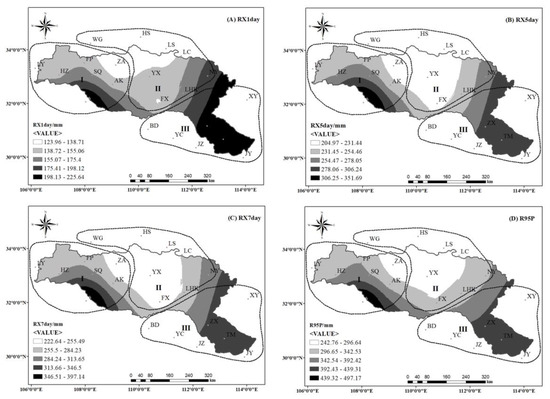 In the literature, a single index was often used in the analysis of extreme precipitation events [57,58]. However, the comprehensive characterization of extreme precipitation events should be described from multiple indicators, due to the limitations of a single index to capture the full picture of extreme precipitation events. In this study, four indices including RX1day, RX5day, RX7day and R95P are derived for analysis. These indices can be enough to capture the full picture of extreme precipitation events in the HJRB.