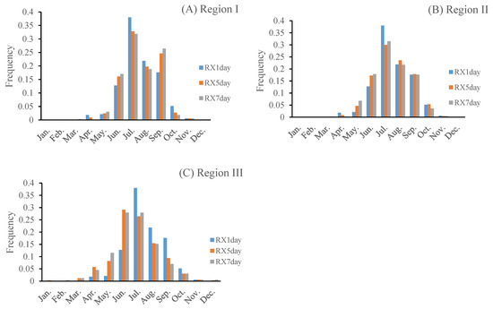 The spatial associations of precipitation extremes between sites and the map of precipitation for HJRB are quantified by kriging interpolation. Estimated maps of annual precipitation extremes in HJRB for RX1day, RX5day, RX7day and R95P with the 100 years return periods are illustrated in Figure 8. It can be observed from Figure 8A–D that precipitation extremes in region I increase gradually from north to south, and plenty of precipitation observations were made upstream in the south of the HJRB next to the Du River, South River and Daba Mountain areas which are close to the Danjiangkou Reservoir. This provides sufficient climate conditions (e.g., humidity and precipitation) responsible for the occurring floods in these regions from the meteorological point of view. In region II and III of HJRB, it can be observed that the precipitation extremes gradually increase from the northwest to the southeast and the precipitation extremes are mainly concentrated in the area of Tianmen, Wuhan and Zhongxiang stations which are located in Jianghan Plain in the downstream part of the HJRB. The results of seasonality of precipitation extremes in 3 HOM regions are illustrated in Figure 9. It can be observed that, for RX1day, RX5day and RX7day in the HJRB, more than 90% of the precipitation extreme events occur during the rainy season from May to October and more than 30% of the extreme events concentrate in July. These events will trigger floods with different magnitudes, and July and August are well recognized as the primary flood-season for such regions.
