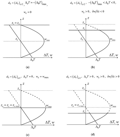 Comparing this system with the set of equations for the dry air thermal convection [43], one can see that they differ only in the right part of Equation (9). Hence, the solution for the set of Equations (8)–(10) is found similarly to that for the dry air set of equations.