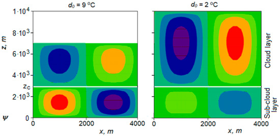 In Figure 2, the stream function for the sub-cloud convection was calculated from Equation (13), and for the cloud convection, it was calculated from Equation (45). Figures show that the growth of moisture in the near-surface layer (drop of dew point deficit ) leads to the development of the cloud convection.