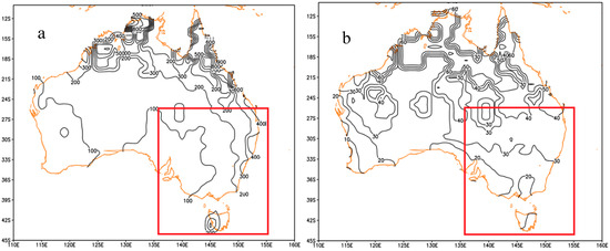 Averaged (a) austral summer rainfall (units: mm; contour interval: 100 mm) and (b) summer rainfall percentage (units: %; contour interval: 10%) during December–January–February (DJF) 1980–2017. The red rectangle denotes the location of southeastern Australia (25–44° S, 136–155° E).