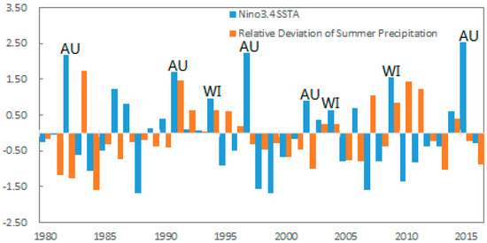 Temporal evolution of the Niño 3.4 SST anomaly (blue; units: °C) and normalized austral summer rainfall (orange) over southeastern Australia in DJF 1980–2017.