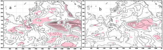 Composite SST anomalies (units: °C) during DJF 1980–2017 for (a) autumn and (b) winter El Niño events. The contour interval is 0.3 °C. Only values significant at the 95% level have been shaded, based on the Student’s t-test.