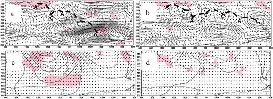 Composites of anomalies of (a) 700-hPa horizontal wind (units: m·s−1) and 500-hPa geopotential height (contours; units: gpm; the contour interval is 5 gpm) and (c) 200-hPa velocity potential (contours; units: 106 m2·s−1; the contour interval is 1 × 106 m2·s−1); divergent wind (vector; units: m·s−1) during DJF 1980–2017 for austral autumn El Niño events. Panels (b) and (d) show the same but for winter El Niño events. The wind scale is shown at the bottom of the respective panels. Shaded areas indicate statistical significance at the 95% confidence level, based on the Student’s t-test.