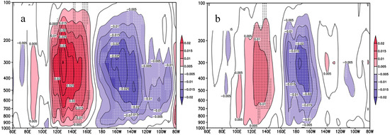 Composite anomalies of longitude–pressure cross-sections of vertical velocity (units: hPa·s−1) averaged along 15° S–15° N during DJF 1980–2017 for (a) austral autumn and (b) winter El Niño events. Dotted areas indicate statistically significant vertical velocity at the 95% confidence level, based on the Student’s t-test.