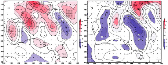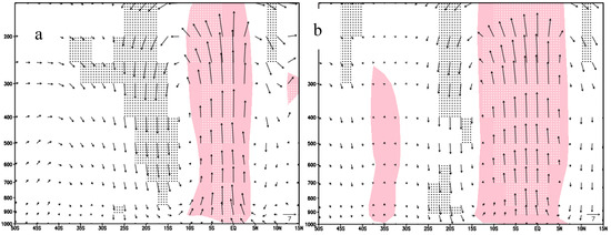 Composite anomalies of latitude–pressure cross-sections of meridional circulations (vectors) averaged along 170° E–170° W during DJF 1980–2017 for austral autumn (a) and winter (b) El Niño events. The units for meridional wind and vertical motion are m·s−1 and hPa·s−1, respectively. The values of vertical velocity are multiplied by −300. Shaded areas have an upward vertical velocity of ≥0.01 hPa·s−1. Dotted areas indicate statistically significant vertical velocity at the 95% confidence level, based on the Student’s t-test.