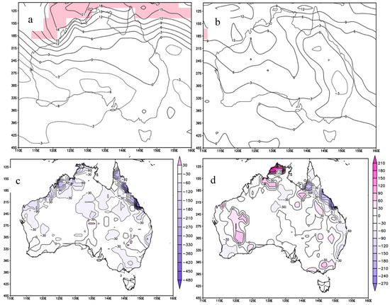 Composite outgoing longwave radiation (OLR) (units: W·m−2) anomalies during DJF 1980–2017 for the austral (a) autumn and (b) winter El Niño events, the contour interval is 3 W·m−2. Shaded areas are statistically significant at the 95% confidence level, based on the Student’s t-test. (c) and (d) are the same as (a) and (b), but for summer rainfall anomalies, the contour interval is 30 mm.