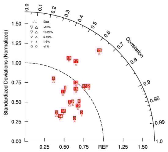 In this paper, we use the Taylor diagram to provide a statistical summary of how well the OISST v2 represents the 19 stations-based observations along the coastal ECSs. In order to do the comparison and evaluation, OISST v2 has been interpolated to the stations’ locations. The correlation and standard deviation on the annual basis are computed and shown in a Taylor diagram (Figure 2). As seen in Figure 2, OISST v2 are clustered around the reference values (REF), except for 4 points (points 3, 13, 14, and 18). Most of them have positive correlations with observations in the range of 0.5~0.9. A total of 79% of these points has a lower standard deviation and smaller root mean square error, which suggests that OISST and in situ water temperatures in the coast area of China agree reasonably well. Additional analysis (not shown here) indicated that there is no statistically significant trend in the differences between the long-term water temperature records. OISST is currently the longest satellite data record that can be used to study long-term SST variability. This data set has been widely used in scientific researches [16,17,18,19]. The suitability of the data base to identify extreme events was previously shown in work of Lima and Wethdy and Liao et al. [16,20].