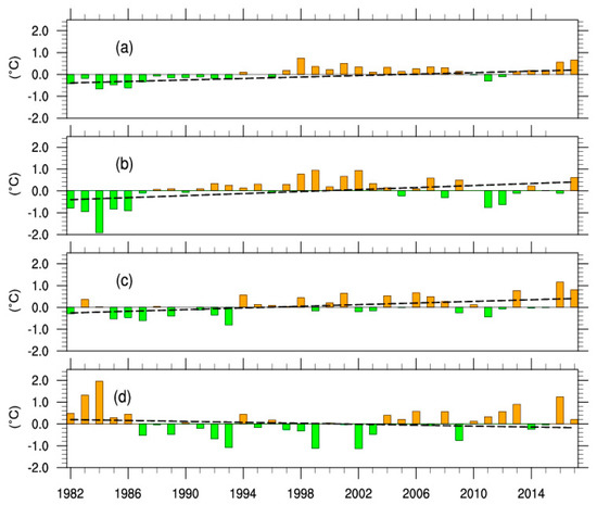 The general warming may have been mainly caused by anthropogenic increase in atmospheric CO2 concentration [33], and partly by the urbanization effect around the observational stations. In this subsection, however, we further analyzed the possible relationship between the warming and the large-scale atmosphere circulation modes. As shown in Figure 4a–c, the WPSH indices of area and intensity notably increased during 1982–2017, in contrast to the westward extension index, which notably decreased with the longitude of the western edge of the WPSH ridge decreasing. The strengthening and westward extension of the WPSH could have caused strong descending motion and contributed considerably to the surface warming in study region. It is clear that the EAWM index shifted through several phases during 1982–2017 (Figure 4d). The EAWM index decreased during 1982–1997 and increased notably after 1998. During this whole period, there was no significant tendency for the EAWM index. Thus, an increasing SST during 1982–2017 is probably related to the influence from the recent strengthening and westward extension of the WPSH.