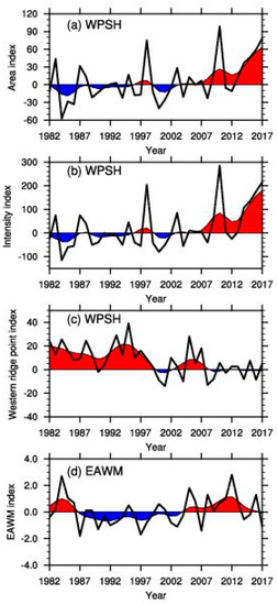 Time series of summer mean (black lines) and 9 year running mean (shaded lines) indices from 1982–2017 of the west Pacific subtropical high (WPSH): area (a), intensity (b), westward extension (c), and time series of the East Asia winter monsoon Index (d). Data are all from the Chinese National Climate Center (CNCC).